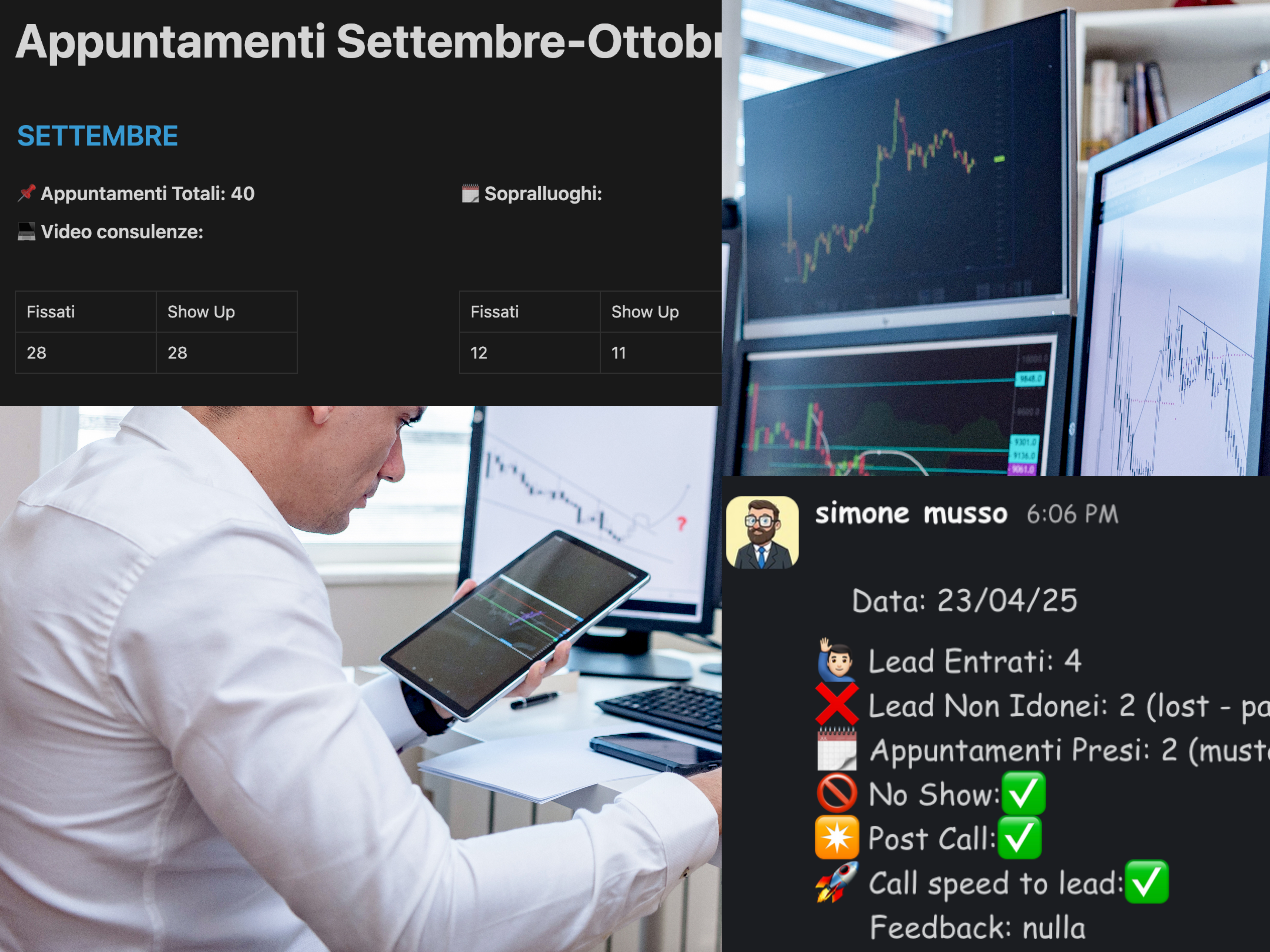 Una volta avviato il sistema, monitoreremo costantemente tutte le metriche fondamentali: dall’acquisizione alla presa appuntamento, fino al post appuntamento. Ogni settimana riceverai KPI automatizzati e faremo call operative per rimanere perfettamente allineati sull’andamento delle attività e sugli obiettivi da raggiungere.